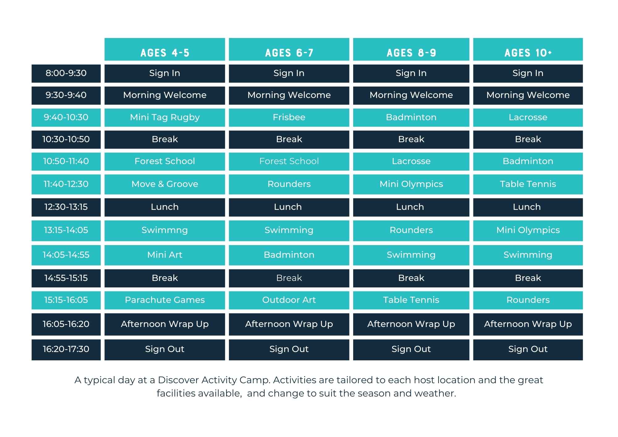 Activity camp sessions take place from 8:00am – 5:30pm. Sessions are available from Monday 6th July until Friday 21st August.